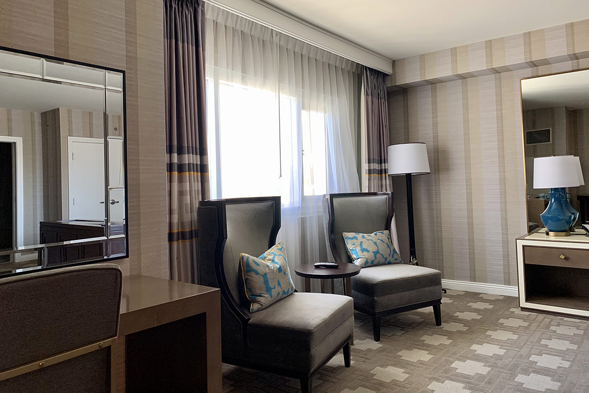 Dès l’entrée, un comptoir pour le minibar, un réfrigérateur et tout ce qu’il faut pour prendre un verre (Sceaux à glace, verres à vin)… j’ai très apprécié cette entrée toute simple ! Puis juste en face un canapé et une table, en gros un mini-salon pour se poser, ce qui est assez rare dans une chambre d’hôtel, à moins de commander une chambre supérieure ou une suite.